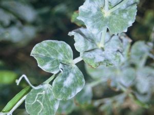 listovima graška primjećuju se žute pjege, a ispod pljesniva prevlaka.