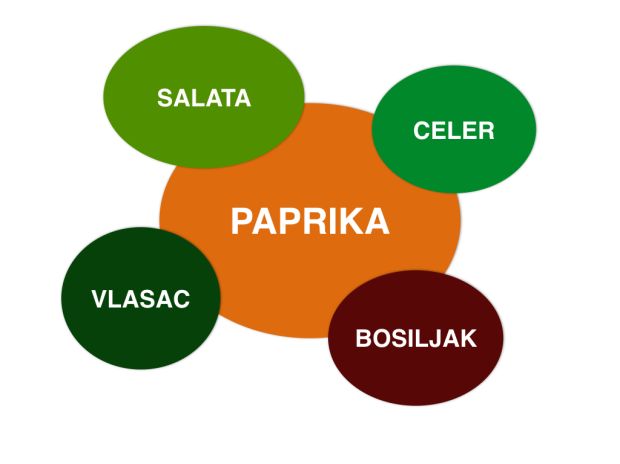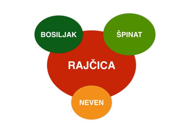 Rajčici su dobri susjedi grah, češnjak, kupusnjače, salata glavatica, poriluk, kukuruz, mrkva, peršin, lisnata salata, cikla, celer, a loši susjedi grašak, koromač, krumpir. Rajčica dobro podnosi samu sebe, a ispred nje u plodoredu ne mogu biti iz iste porodice npr. krumpir ili paprika, a nakon rajčice sade se mahunarke. Paprika također ne podnosi samu sebe.