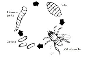 Nakon 3 ili 4 tjedna se iz jajašca razvijaju ličinke koje se zabuše u vrat korijena ili korijen kupusnjače. Nagrizaju korijenje, a lišće postaje modrozelene boje te biljke rastu vrlo sporo i propadaju. Ako je više od 5 ličinki po jednoj biljci u isto vrijeme, to se odvija vrlo brzo. Nakon mjesec dana hranjenja, ličinka se začahuri i započne novu generaciju. Kupusna muha ima 3 generacije godišnje.