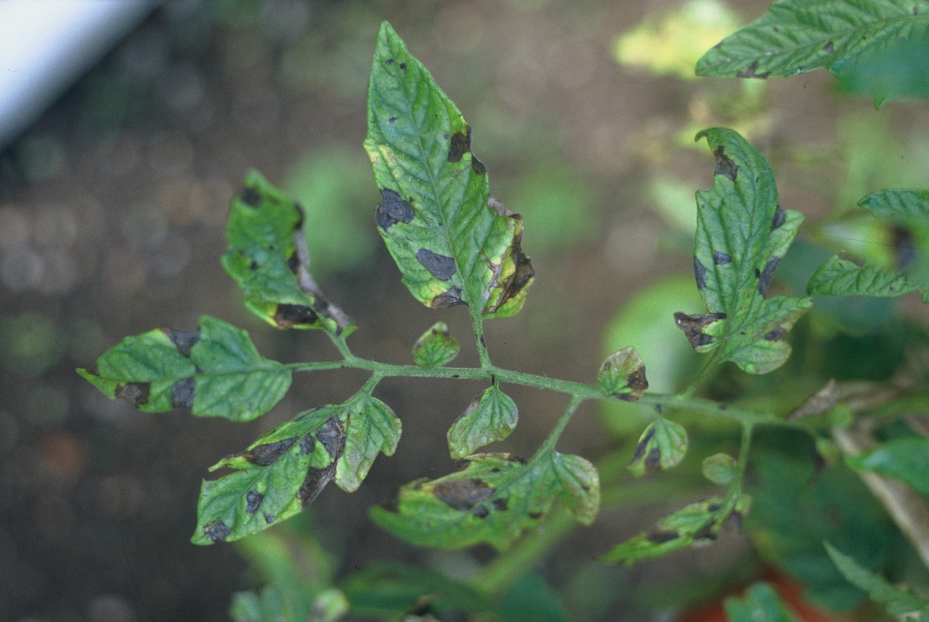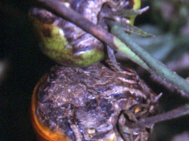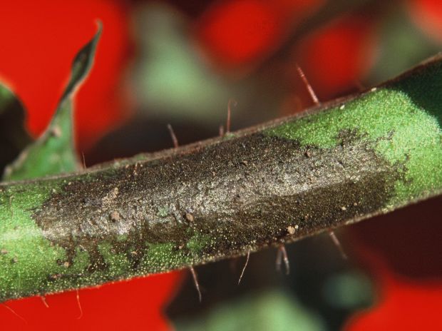 Na starejših listih rastlin opazimo sivozelene pege, na spodnji strani listov pa je bela plesniva prevleka. Pege se pojavljajo tudi na steblih, ta se sušijo in odmirajo. Plodovi so porjaveli in razpokani.