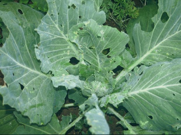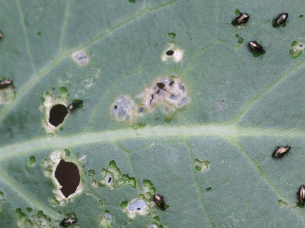 Prepoznamo ga tako, da na listih rastlin opazimo drobne luknjice. Majhen, črn, 2 milimetrski hrošček sesa liste, ko se vrtnini približamo, odskoči.