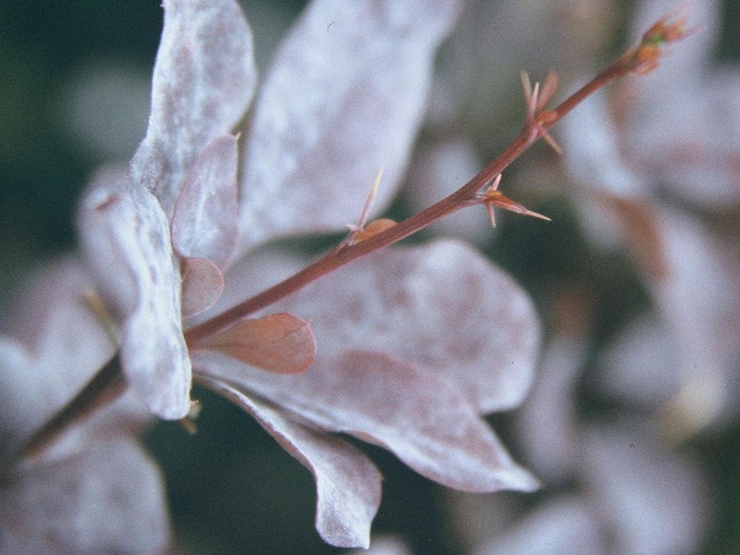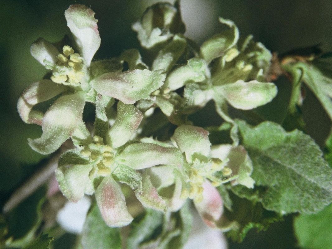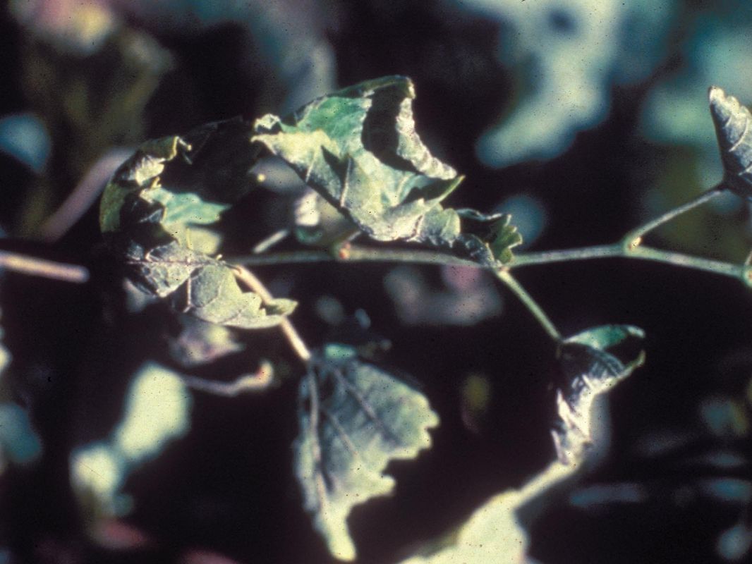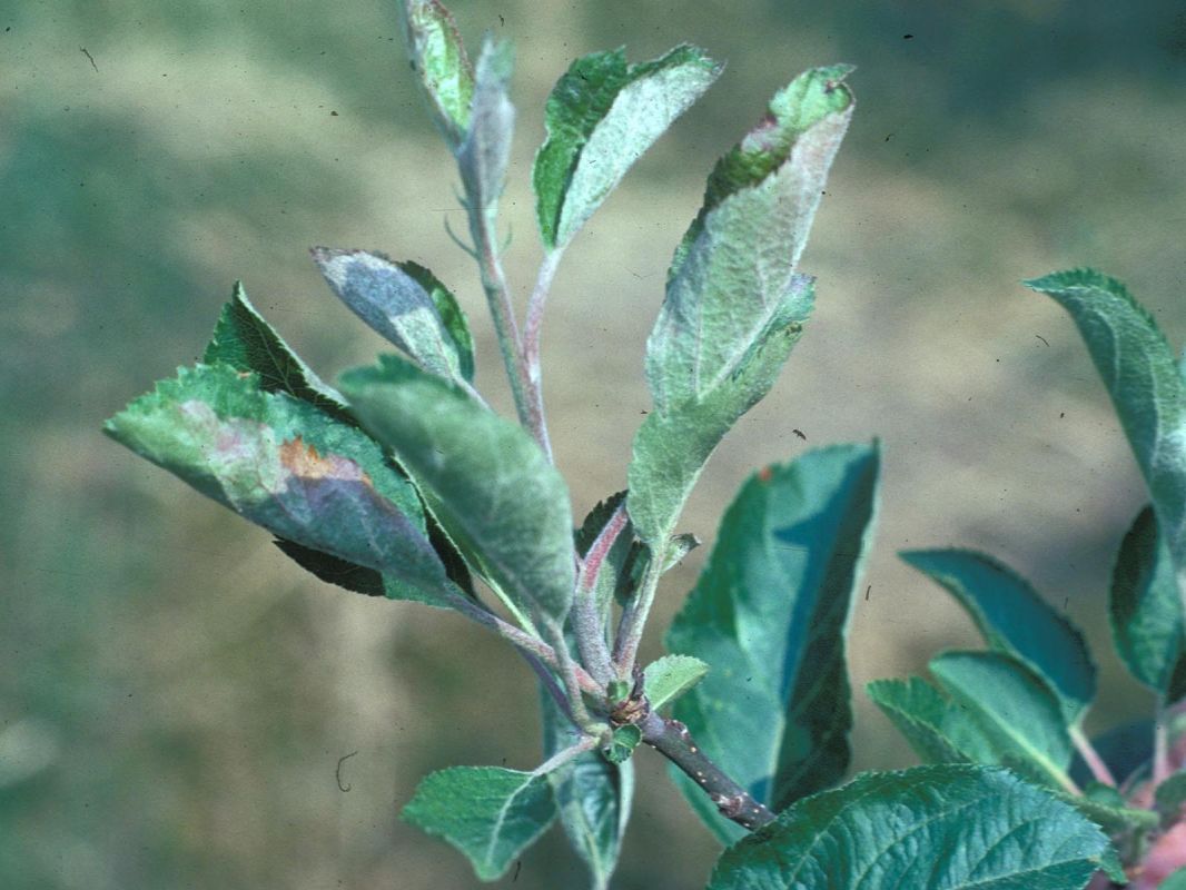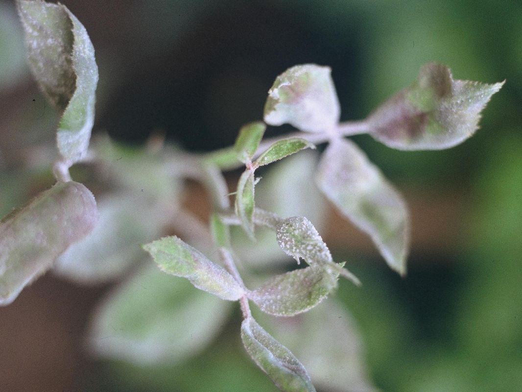 Na zgornjih straneh listov opazimo koprenasto prevleko bele barve, ki se hitro širi po rastlini. Napadeni listi se zvijajo, prizadeti popki pa se težko odpirajo.