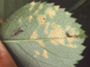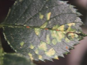 Rja na vrtnicah povzroča oranžne pege na spodnji strani listov, na zgornji strani pa opazimo rdečkaste do oranžne pegice. Oboleli listi se zvijejo in posušijo.