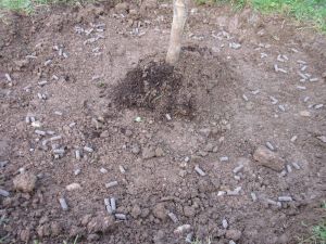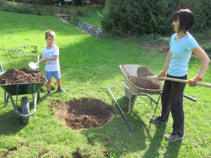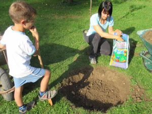 damo na kompostni kup. Z lopato izkopljemo okroglo sadilno jamo.