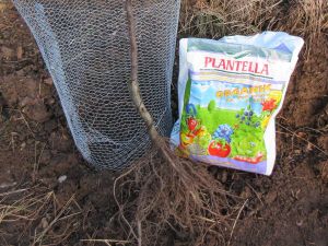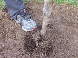 Preostalo zemljo zmešamo z dvema pestema organskega gnojila Plantella Organik in drevo zasujemo. Ko pridemo do nekaj centimetrov pod robom sadilne jame, zemljo okoli drevesa potlačimo s čevljem in ga tako učvrstimo.